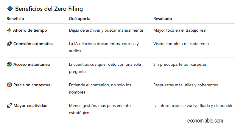 El Zero Filing ahorra tiempo y elimina tareas de organización manual, permitiendo centrarse en el trabajo real.