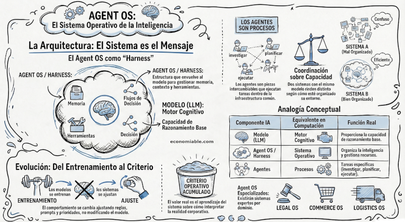Ese sistema puede entenderse como un Agent OS: una infraestructura diseñada para ejecutar inteligencia dentro de contextos operativos complejos.