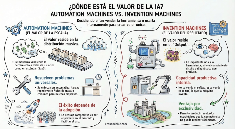 La distinción entre Automation Machines e Invention Machines conduce a una pregunta clave en la economía de la inteligencia artificial: