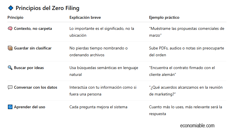 El Zero Filing se basa en cinco principios sencillos: trabajar por contexto y no por carpetas, guardar la información sin clasificar ni nombrar, buscar por ideas en lenguaje natural, conversar directamente con los datos a través de asistentes de IA, y permitir que el sistema aprenda con el uso.